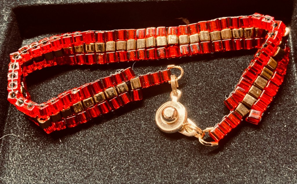 Red & gold 3 square bead loom bracelet w GP TOW BAR CLASP 16 cm