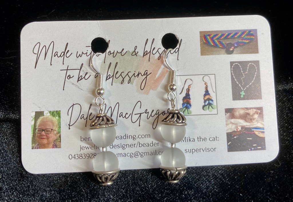 creating earrings to go with fibre optic neck crosses- green, blue, white, grey and orange done so far